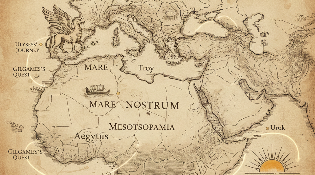 This banner was generated using the Nano Banana model. It contains significant geographic and historical inaccuracies—most notably in its distorted shorelines and the fictionalized placement of ancient landmarks. We include it here not as a precise reference, but as a site for interrogation: a reminder of how digital tools can mediate, and sometimes obscure, the intellectual geographies they attempt to represent.
